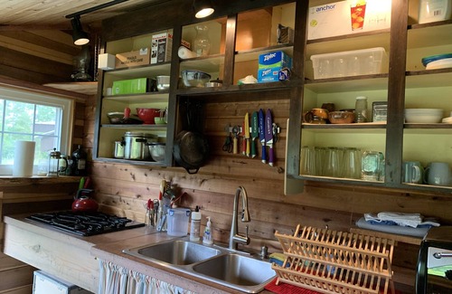 -An enclosed kitchen is next to 12'x12' with a small fridge, gas stove top, and large toaster oven. The kitchen includes many, but not all kitchen supplies you might need. Please see the kitchen photos in case there is something unique you need for a specific meal. *If our family were traveling, I would likely bring my large cast-iron pan and some glassware for leftovers. There is a french press and a coffee grinder, but be sure to bring your own coffee!