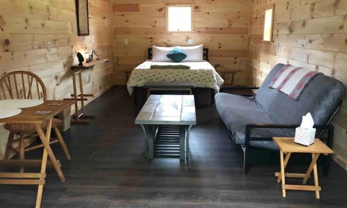 Spend your day/weekend glamping in a piece of paradise. The Tiny House is tucked into the corner of our lower field by the wood line. Fall asleep to the relaxing sounds of the stream right outside your French doors. It's a short walk to the common areas which include outdoor toilet facilities & warm water showers with sinks, and the pavilion with electric, wifi, water, & rustic kitchen. Play a round of disc (Frisbee) golf, horseshoes, star gaze, or hike here or a local State Park. Watch out for the Amish buggies.