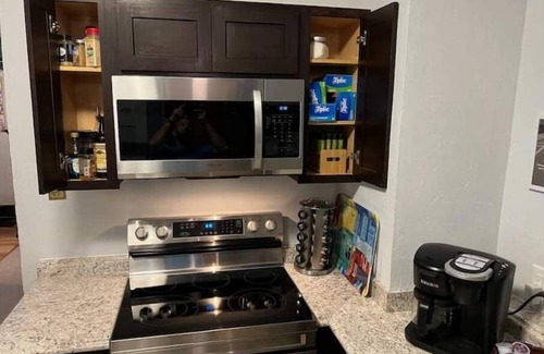 Fully stocked with cooking essentials-pots, pans, casserole dishes, baking sheets, pot holders, hot pads, cooking utensils, herbs/spices, cutting board, mixing bowls, measuring spoons/cups, toaster, wine bottle opener, crock-pot, strainer, food storage containers.