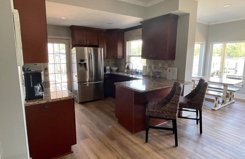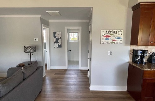 Start your mornings with a cup off coffee (k cup or pot) from a dining room with a charming wood table large enough for everyone and a perfect view or on the new second floor balcony, or on the downstairs covered patio, or the open deck! Then hit the lake enjoying paddle boarding, kayaking, swimming, fishing and lounging, or you can choose to include a private pontoon boat delivered to your dock!