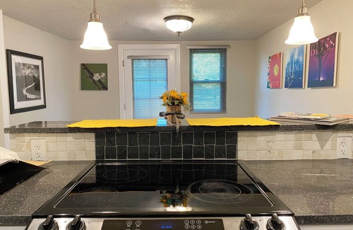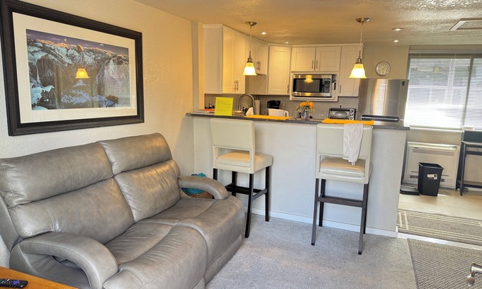 Relax in the carpeted living room featuring a leather loveseat and a flat-screen TV with Roku for your entertainment pleasure. The open kitchen, adorned with a large window and eat-in counter, is fully equipped with an electric range, microwave, dishwasher, toaster oven and refrigerator. We've got you covered with basic cooking ingredients including spices and condiments for your convenience.