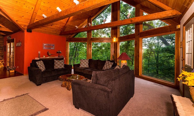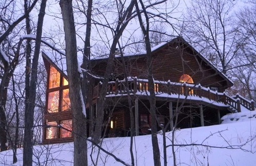 Welcome to OH MY VIEWS! Check Out this Home and Fab Fire Pit! Spacious and Incredible!, the perfect lodging for your dream wedding in Galena, Illinois. This stunning log home provides a captivating backdrop with its breathtaking views and ample space, making it ideal for hosting intimate ceremonies or festive receptions. With five large bedrooms, two family rooms, and plenty of outdoor areas filled with picturesque scenery, you and your guests will create unforgettable memories in a serene setting that embodies romance and charm.