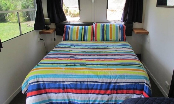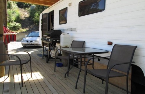 Powered 10mtr long caravan (35 feet) covered in deck, BBQ with outdoor seating & hammock. Oil heater for heating, cell phone coverage (no WIFI) Kitchen has large pantry storage, breakfast bar. Sleeps 4 (5 with prior notice), room to pitch a tent.