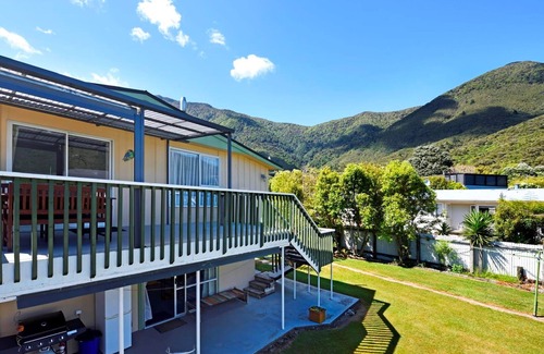 Situated on quiet back section, this bach is secluded and private. There is a large flat area of lawn and has deck areas upstairs and downstairs. Great views from upstairs.