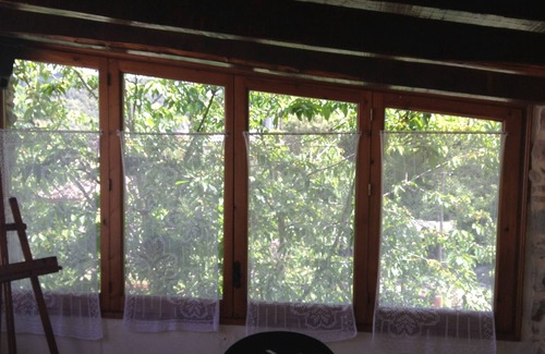 On the upper floor, we find two spacious double bedrooms, and another room with a bunk bed and a pull-out bed, a large full bathroom, and going out through the outer corridor you reach the studio at three winds overlooking the town, the valley and the creek.