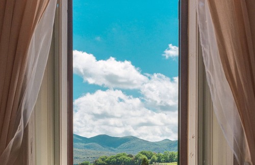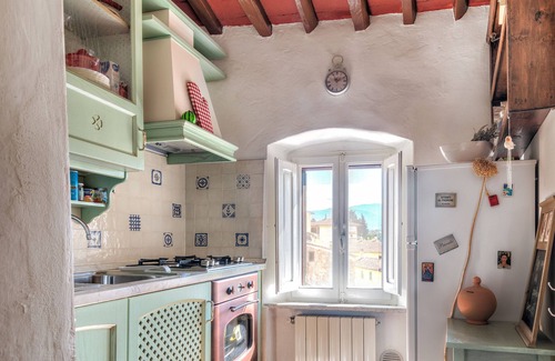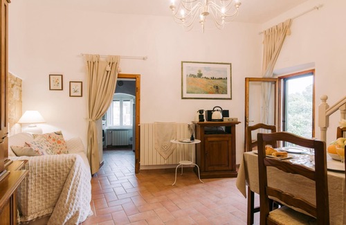 Ancient and romantic country house with stunning views over the hills. Completely restored it has 3 bedrooms and 2 bathrooms one each floor, first floor 2 double bedrooms with air conditioning finely furnished in shabby chic style, a small and a larger with view and possibility third bed.