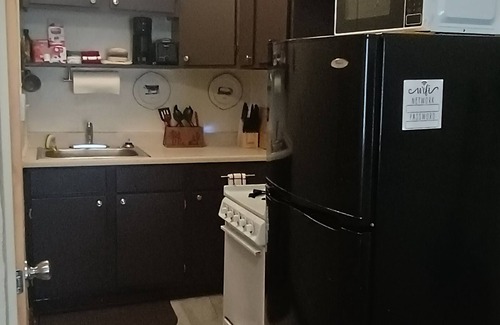 There is an code entry keypad, full kitchen, bathroom, futon and a queen size bed. Pets are welcome!