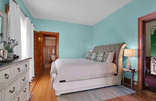 The Signature Suite at The Old Library Inn offers a spacious and elegant retreat, ideal for couples celebrating special occasions. Located on the second floor, this guest favorite features high ceilings, hardwood floors, and refined furnishings. The suite includes a king-size bed and a separate parlor, both equipped with their own TVs and separated by classic pocket doors. The private bathroom, noted for its vintage charm, is situated just outside the suite. Modern amenities such as Wi-Fi, air conditioning, heating, an iron, and a hairdryer ensure a comfortable stay. For additional guests, a deluxe inflatable queen mattress is available for an extra fee.