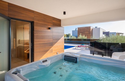 Vodnjan: Modern villa "Old Olive VI", 3 storeys, built in 2023. In the hamlet Salvela 1 km from the centre of Vodnjan, 7 km from the centre of Fažana, 10 km from the centre of Pula, in a sunny position, 7 km from the sea. Private: property 835 m2 (fenced), swimming pool (45 m2, depth 150 cm, seasonal availability: 01.Mar. - 01.Nov.) with internal staircase. Unconventional pool shape. WC in the pool area, outdoor shower, hot tub, terrace (65 m2), garden furniture, barbecue. In the house: internet access, sauna, table tennis, billiard table, table football, washing machine, tumble dryer. Parking (for 3 cars) at the house on the premises. Shop 1 km, supermarket 1 km, restaurant 1.5 km, bus stop 1.3 km, pebble beach 7 km, public bathing area 7 km. Golf course (18 hole) 7 km, tennis 2 km. Nearby attractions: NP Brijuni 7 km, Amphitheater 11 km. Groups of teenagers on request only.