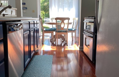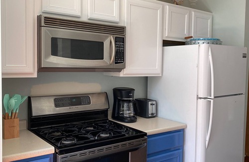 Fully stocked kitchen with drip coffee maker, full size refrigerator, dishwasher, microwave, gas range. 1 bath with tub/shower and washer/dryer.