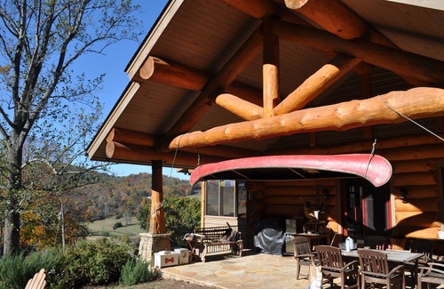 Chestnut Oak Farm is a luxurious western-style lodge retreat on a 90 acre horse farm near the base of Old Rag Mountain. The lodge was constructed in 2009 using granite blocks from the farm and huge Virginia pine logs in a western style of rustic elegance. The lodge is surrounded by decks and porches to take in the magnificent view over Hidden Valley, Old Rag Mountain, the farm's twin ponds, and the horses grazing in the fields. The lodge is equipped with a Chef's Kitchen, huge dining room (we have seated sixteen), double-sided fireplace, baby grand piano, screened porch, and covered porch. The main lodge house has three Master Bedrooms, and two other large bedrooms with a shared bath. Downstairs is a walkout game room with foosball, ping pong, bar, and a fire pit/movie pit with 52" screen TV. The outdoor 8 person hot tub is steps away, overlooking the pond.