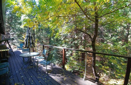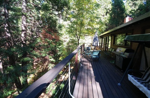 Fun for the kids includes a large collection of games, puzzles, toys, a piano, and costumes. Relax on one of the decks among the 200 ft tall trees while the kids play in the creek, explore the back yard, or put on a play - the backyard includes a stage complete with stage lights for evening performances.