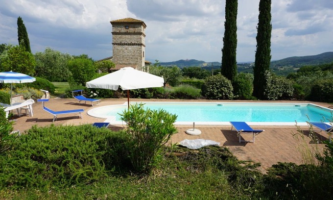 The country house is located in the beautiful Umbrian countryside, “green lung" of Italy, with views of Todi and the surrounding area. The stone structure has been carefully restored: it has a park of approx. 3000 meters with 2 hectares of olive grove, fruit trees, aromatic plants and trees, in an area closed to hunting where you can see hares, hedgehogs, pheasants. It also includes a private swimming pool (15x6) overlooking the surrounding countryside at the full disposal of guests (with sunbeds and umbrellas), which is a real oasis of peace and relax. The house is also equipped with all the comforts and equipment necessary to live in complete autonomy: kitchen equipped with everything you need, living room with fireplace and large table for 8 people, overlooking the garden -, 4 bedrooms, 3 of which with private bathroom; then there are the upper floors, inside the tower, where you can relax while enjoying the beautiful panoramic view. Outside there is also a table with 8 seats in the brick area at the back of the house, protected by a large umbrella, where you can enjoy wonderful breakfasts and meals in the open air. The property is ideal for those who want to enjoy the beautiful Italian countryside - not by chance in these areas are artists, foreign painters to represent unique landscapes, - and for those who want to relax in nature and in an old farmhouse, spacious and equipped with all amenities, with the possibility of using the private pool and the corner dedicated to it. Within half an hour by car, however, you can reach several cities of art and medieval villages included among the most beautiful in Italy. If you love deep Italy and relaxation, try our structure: you won't regret it.