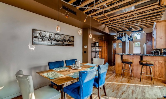 Our three-story downtown loft offers several large spaces to enjoy each other’s company while still reserving ample private space to retreat and recharge, all in a location that can't be beat. The open living and dining area are perfect for gathering and there is a small patio off the kitchen for those interested in sparking up the grill. Be sure to head upstairs at golden hour and enjoy the beautiful sunset and mountain views from your private rooftop deck!