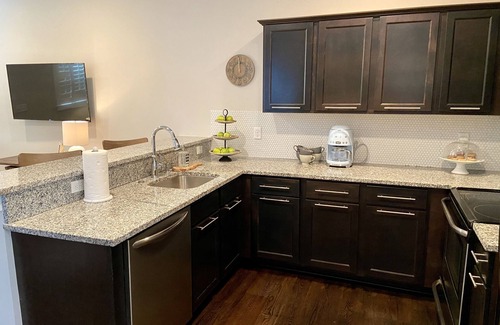 The separated bedroom features a luxurious king size bed, reading chair, flat-screen TV, sound machine, large closet w/ plenty of hangers/luggage storage, iron + and en suite bathroom with linens + complimentary toiletries. The space also includes a washer/dryer, as well as detergent + dryer sheets for your convenience.