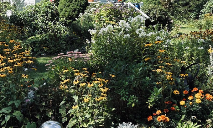 Front porch overlooks vintage garden, flower boxes and provides a spot to enjoy an early morning cup of hot coffee.