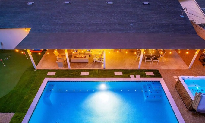 - Outdoor Oasis: The expansive backyard features a hot tub, fire pit, BBQ area, and putting green, providing ample opportunities for relaxation and fun amidst your wedding festivities.