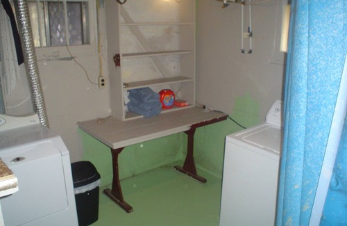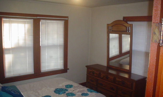 Easy access located center of town. This is a 4 bedroom home, 2 nice bedrooms upstairs with a Queen bed in the Master bedroom and a real nice full size bed in guest room. 2 bedrooms downstairs with 1 nice queen bed and the 4th bedroom downstairs has a twin bed and then a Rollaway for a 5th bed. Living room has reclining couch, super soft big man recliner, 55" flat screen TV with 155 channels of Direct TV . Kitchen is equipped with most needed pots and pans and dishes, microwave, drip coffee pot, etc. Small dining area with 2 bar stools. This is an old house, approximately 75 years old, we have tried to make it appealing but expect some minor deficiencies you could expect in an old house.