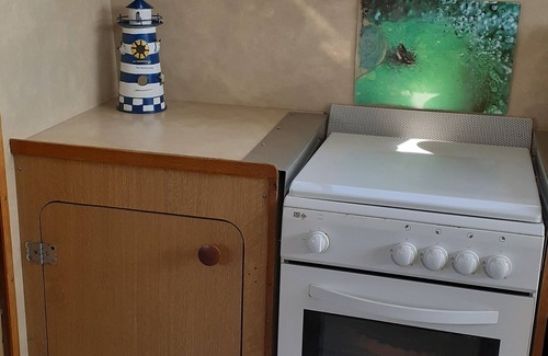A fully equipped American kitchen with fridge, gas cooker, microwave, TV, coffee maker, fan, boat radio CD player.