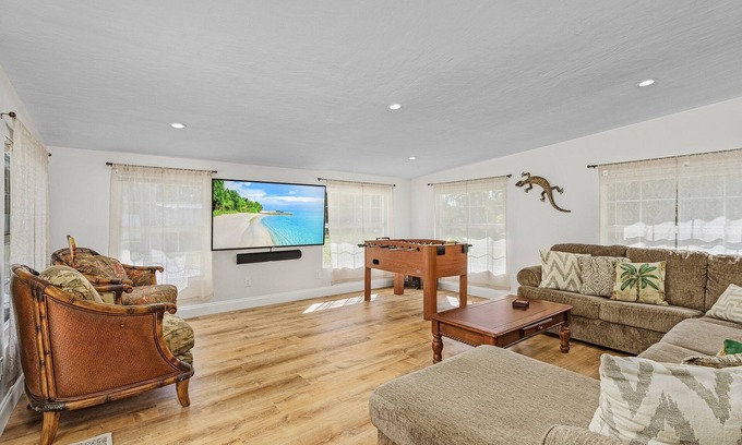 This recently renovated vacation destination is a rambling four-bedroom, three-bath private home with swimming pool that's perfect for a large or extended family. It sleeps up to 12 guests with no sleeper sofas, and is located on the mainland yet within a 5-7 minute drive to the Sanibel Causeway or an 8-10 minute drive to Estero Island at Fort Myers Beach. Sanibel Island has its beaches famous for sea shells, and Fort Myers Beach with all it's beach activities, the Margaritaville Resort and fast Key West Express boat. This location also puts you in very close proximity to Fort Myers with the Edison, Ford and Firestone winter home museums. RSW International Airport, Bonita Springs, Naples and Marco Island are also within approximately a one-hour drive.Amenities include a swimming pool, foosball in the game room, horseshoes in the back yard, darts on the patio, BBQ grill, ample off-street parking, three-zone central air conditioning, ceiling fans, complimentary WiFi, all linens and towels provided, a private laundry room and a quiet, fenced in, one acre lot for everyone to play on and enjoy.