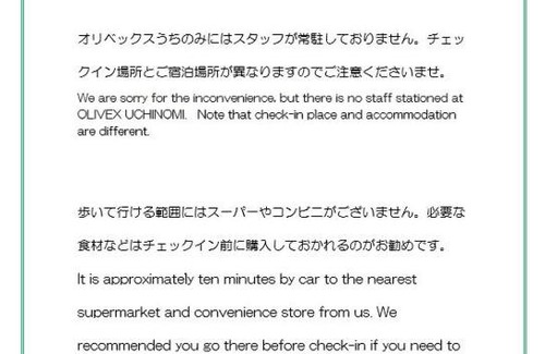 Check-in time for Olivex Uchinomi starts counting from 3:00 PM and check-out is until 10:00 AM. However, early check-in or late check-out can sometimes be negotiated between the guest and the owner or the manager of this property.