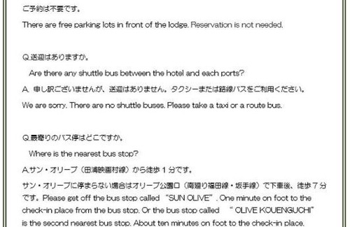 Based on the information received from our partner, the Olivex Uchinomi has not specified they are wheelchair accessible. Likewise, there is not an elevator specified as being available at the property. Specific accessibility details may be addressed in the property details section of this page.