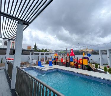 Offering an open-air bath, Olivia Chalet فلة أوليفيا provides accommodations in Al ‘Aqar. This property offers a private pool, free Wifi, and free private parking. The chalet has an outdoor fireplace and a hot tub. Opening onto a balcony with pool views, the spacious air-conditioned chalet consists of 2 bedrooms. Providing a terrace with mountain views, this chalet also offers a satellite flat-screen TV, a well-equipped kitchen with an oven, a microwave, and a toaster, as well as 3 bathrooms with a walk-in shower and free toiletries. There's also a seating area and a fireplace. A children's playground is also available at the chalet, while guests can also relax in the garden. Muscat International Airport is 94 miles away.