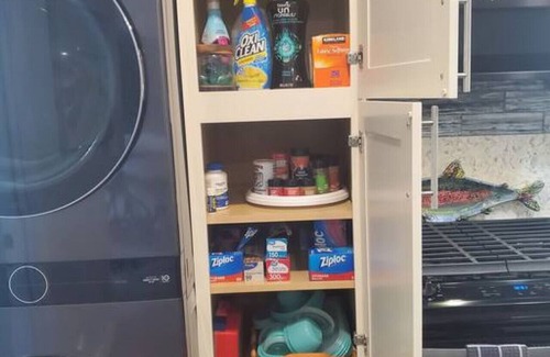 BRAND NEW everything! Clean and Comfortable. Roomy walk in shower with bench and stylish quartz and tile accents. Kitchen has full size fridge sink, and beautiful gas stove. The studio has full sized stackable washer/dryer and the living room area offers leather sofa and a TV console with fireplace that heats as well.