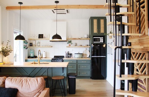 The main area of the treehouse offers a beautiful open concept full kitchen (equipped with full size dishwasher, a 20” stove/oven, microwave, full size fridge/freezer, crockpot, toaster, Keurig coffee maker, and living room with a built in queen bunk with stairs leading up to an upstairs spacious bedroom with beautiful views and a cozy queen bed and an office area for those who need to work.