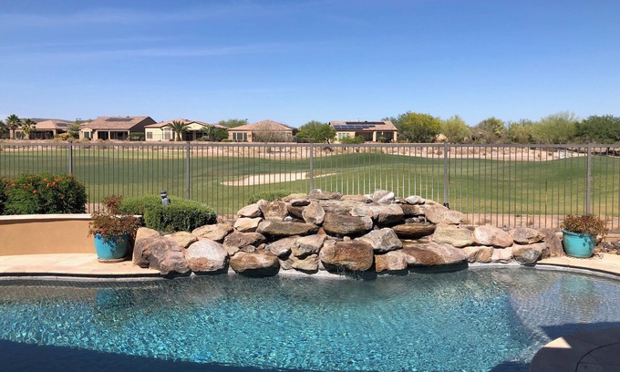 Beautifully furnished 2600 square feet executive style 3 bedroom, 2.5 bathroom home perfect for those who want to pamper themselves. Our home is located in the 55+ community of Trilogy at Vistancia. It sits on the 8th hole and has its own pool for those that don't want to have to use the community pool. Lounge and entertain outside with misters surrounding the patio's two chaise lounge chairs, firepit with patio couches and chairs, and a nice outdoor built in BBQ with bar stools for guests to keep the cook company. Our home faces West, which means the backyard always seems to be the perfect temperature.