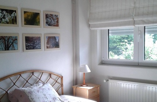 B & B (king-size bed) in a house situated on a hill overlooking the castle of Leiria. It offers a double en-suite bedroom. A second bedroom (double bed) can be spared only in case of a 3rd (or 4th) guests traveling together (children or friends). "Room with a View" has a balcony with an independent way out to the terrace and garden. Full equipped kitchen at the guests' disposal.