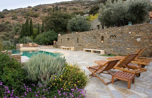 Our secluded country home sits on the slope of a lush hill, with stunning panoramic views of the capital of Andros 'Chora', the valley and the Aegean Sea. It was custom built by a re-known architect respecting the traditional architecture of the island, using the local stone.