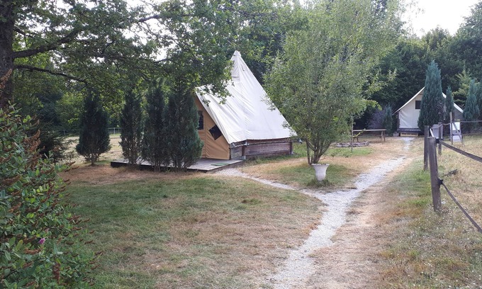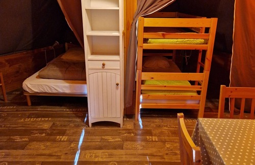 Teepee-shaped hut with advanced in a quiet and green place 4 places with wooden base including 2 bedrooms the first with a bed of 140 cm and the second with 2 bunk beds, a living room with table and chairs and a terrace with chairs long