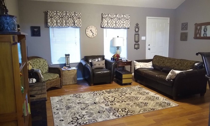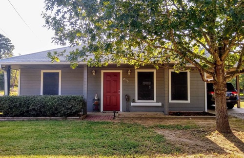 Great location with new pier, double hammock between large trees beside pier, fire pit/grill combo with wood to burn, nice new patio furniture, open floorplan, raised ceilings, ceiling fans throughout, box fan, 2 bedrooms-1 king and 1 queen, leather sleeper sofa, extra deep tub/shower with nice combo rain shower head and extra hand-held one, 3 new large smart TVs, wifi, kitchen/dining with stove, DW, microwave, coffeepot, and equipped for all basic cooking and dining needs. Long attached carport accommodates two vehicles back to back. 1st Monday shopping, Brookshires grocery store and Walmart supercenter are all less than a mile away.
