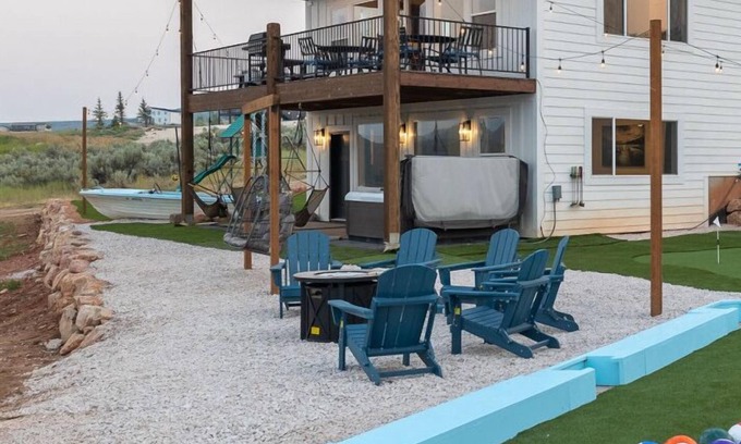 Your experience at this home will be enhanced by its exceptional amenities. Enjoy a fully equipped kitchen that invites culinary creativity, along with comfortable gathering spaces including an expansive living room with spectacular lake views. After a day of festivities, unwind in the private hot tub or lounge on the sky swings while taking in beautiful sunsets. For entertainment, challenge your guests to a friendly game of ping pong or explore the fun Bear Lake Monster-themed basement, designed perfectly for relaxation and bonding.