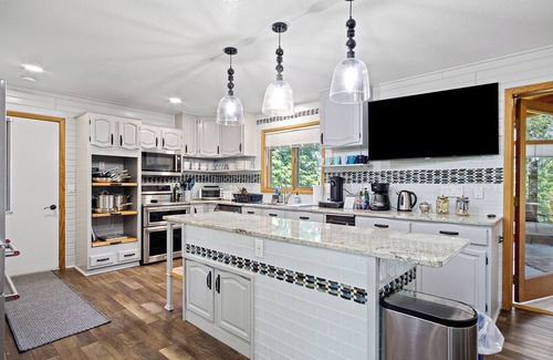 Your stay includes a wealth of amenities designed for comfort and relaxation. With two spacious bedrooms, including a lavish primary suite featuring a king bed and private porch, you'll have restful nights after days filled with action. The fully equipped kitchen and inviting living spaces ensure everyone feels at home, while the sunroom provides a tranquil setting for enjoying sunsets over the water. Outside, the expansive patio area and dock allow for leisurely afternoons by the lake and the opportunity to host yard games or evening bonfires under the stars.