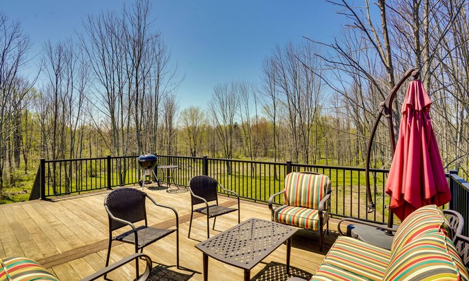Looking for a place to rest, relax, and unwind? Look no further than this 1-bedroom, 1-bathroom, New York vacation rental in Phoenix. This cozy home, featuring in-unit laundry, a pellet stove, and a spacious deck overlooking the woods, is a perfect rural getaway. Outdoor enthusiasts will love the on-site hiking trails and ponds. Take advantage of the 19-mile trip to Lake Ontario for swimming, fishing, and boating. End the day on the leather couch to watch a movie on the flat-screen TV.
