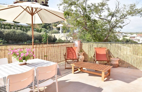 This apartment (55 sqm) on the top floor, offers 4 beds, ideal for a family consisting of parents and one, two boys. A furnished furnished terrace offers a view of the garden and partly of the sea. The two-room apartment includes: double bedroom (double bed), living room with double sofa bed, built-in kitchen, bathroom and furnished terrace. The owners live on the ground floor.