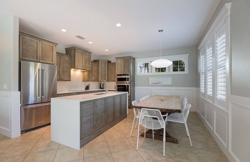 The home’s bright and airy living room features abundant natural light, comfortable seating, and a TV for family movie nights. The modern kitchen includes stainless steel appliances, ample cabinet storage, and everything you need to prepare group meals or snacks for the beach. A large dining table makes it easy to gather for meals or board games.