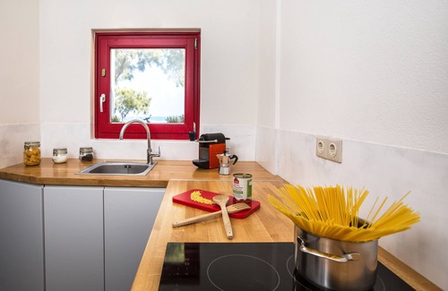 The house is 35sq.m. and has a bedroom with a traditionally built queen size bed and a big closet. A built sofa bed in the living room (or a travel cot) can accommodate a child if needed (upon request). Note that there is no door between the bedroom and the living room.