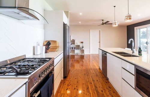 The fully equipped kitchen invites you to cook and connect with a five-burner gas stovetop, large double fridge, dishwasher, Smeg toaster and coffee machine, all at your fingertips. Share slow breakfasts or lively dinners in the sunlit dining area with seating for six. For something more scenic, step outside to the waterfront deck and enjoy your meal with uninterrupted lake views. The spacious backyard is perfect for letting kids and pets roam freely, while adults can relax by the BBQ or gather around the lakefront fire pit as the sun sets over the water.