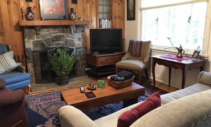 Cozy older home with oriental carpets, modern conveniences, WiFi, and wood paneling, surrounded by forests and privacy fencing. On the central campus of the University of the South with golfing, food services, and on-campus events within easy walking.