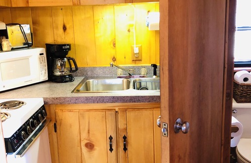 This charming fishing bungalow sleeps 5 - 3 in the loft! This knotty pine cabin with vaulted ceilings is not only quaint and nicely furnished, but it has all that you need for a fishing weekend. It has a fully equipped kitchen, refrigerator and bathroom with a tub/shower combination. There is a queen bed in the open area with a dining table and recliner. And the vaulted ceilings enable both a queen bed and a twin bed on opposite lofts of the cabin. The kitchen has all everything you need - necessary utensils, stove/oven, microwave - except a dishwasher.