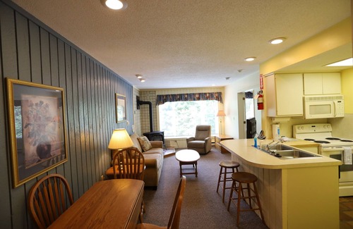 One Bedroom Condo at Inns of Waterville Valley with sleep sofa sleeping 4. Fully Equipped Kitchen with Single/Coffee Pot Combo, Dishwasher, and Microwave. Shared Outdoor Grilling Area