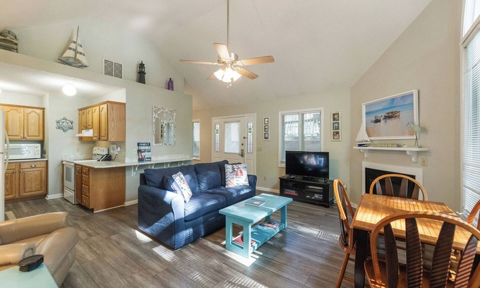 This beautiful one-bedroom condo is tucked in a peaceful lakeside setting among oak and hickory trees and is a great place to get away. The living area has traditional furniture, including two new leather recliners, a 43-inch smart TV and a fireplace. The sofa bed folds out easily and is great for children or grandchildren! The bedroom features a comfortable king-sized bed and a wall-mounted flat-screen TV. This condo has coastal décor, an attractive updated counter top, new blinds, a nearly new heating and cooling system for all kinds of weather and a whirlpool tub.