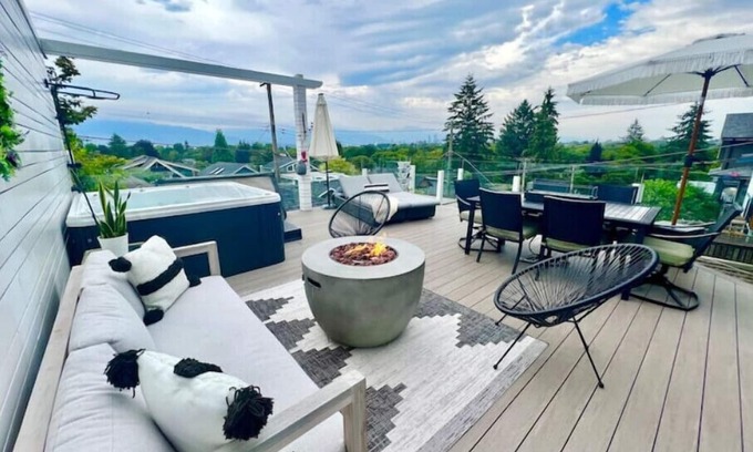 Located in the heart of Vancouver, close to beaches & restaurants & UBC. This private one bedroom garden level is newly renovated with a full kitchen and living room with a queen sized pull out bed. You have your own private outdoor sitting area in the garden. There is also a play area with a hammock swing, play house, & water table for little ones. You have access to a large shared deck that has a hot tub, fire table, dining table, bbq, day bed & sofa with city, mountain & ocean views.