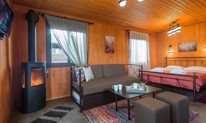 Our One Bedroom Mountain Bungalow is a spacious wooden Bungalow of 35 square meters Consists of one bedroom with a double bed and a living room with a sofa bed. The room can host up to 4 guests.