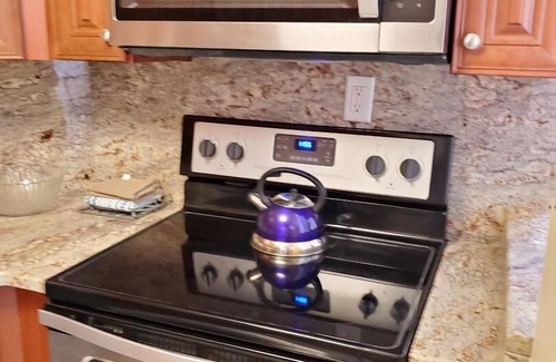 The fully equipped kitchen with granite countertops contains a full size refrigerator, stove, oven and dishwasher. Microwave, coffee maker, toaster, utensils, glassware, plates, and silverware are supplied.