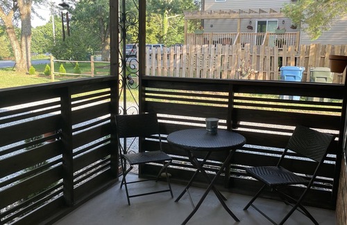 You'll start with a private porch that has patio furniture. You have a private entry that leads to the living area with couch. There is a kitchenette with sink, microwave, mini fridge, toaster, coffee machine, and dishes. Private bathroom with towels, shampoo/conditioner/soap. Private bedroom with TV (wifi) linens and bedding, closet, iron/board, clothes hamper.