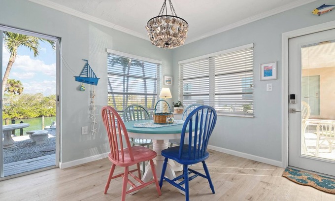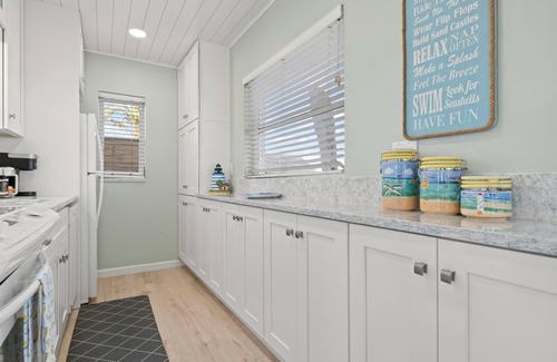 Adorable beach cottage located on bayside of Casey Key. Sit outside on the nicely landscaped patio outside your back door & fish right off the docks. Only a short walk across the street to beautiful private Nokomis Beach. Beach chairs and umbrella available on request. King size bed. Couch converts for an additional sleeping space. Stackable washer/dryer inside condo. Full kitchen with all utensils and dining area with nice view of the canal.